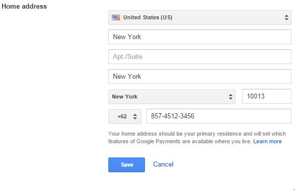 6. Sambil menunggu kode keluar, anda harus mengatur Google Wallet terlebih dahulu. Jadi mengapa kita harus mengatur Google Wallet karena untuk saat ini saldo Google Play hanya mendukung wilayah Amerika saja, sehingga kita yang berada di Indonesia harus merubah wilayah dari Indonesia ke USA. Caranya sangat mudah kok. Yang pertama kunjungi Google Wallet atau klik disini (gunakan email yang sama dengan email di Google playstore anda). Masuk ke pengaturan tepatnya pada bagian Home Address. Samakan data dengan gambar di bawah ini, untuk nomor bebas yang penting nomor tersebut valid. Apabila sudah save agar tersimpan.